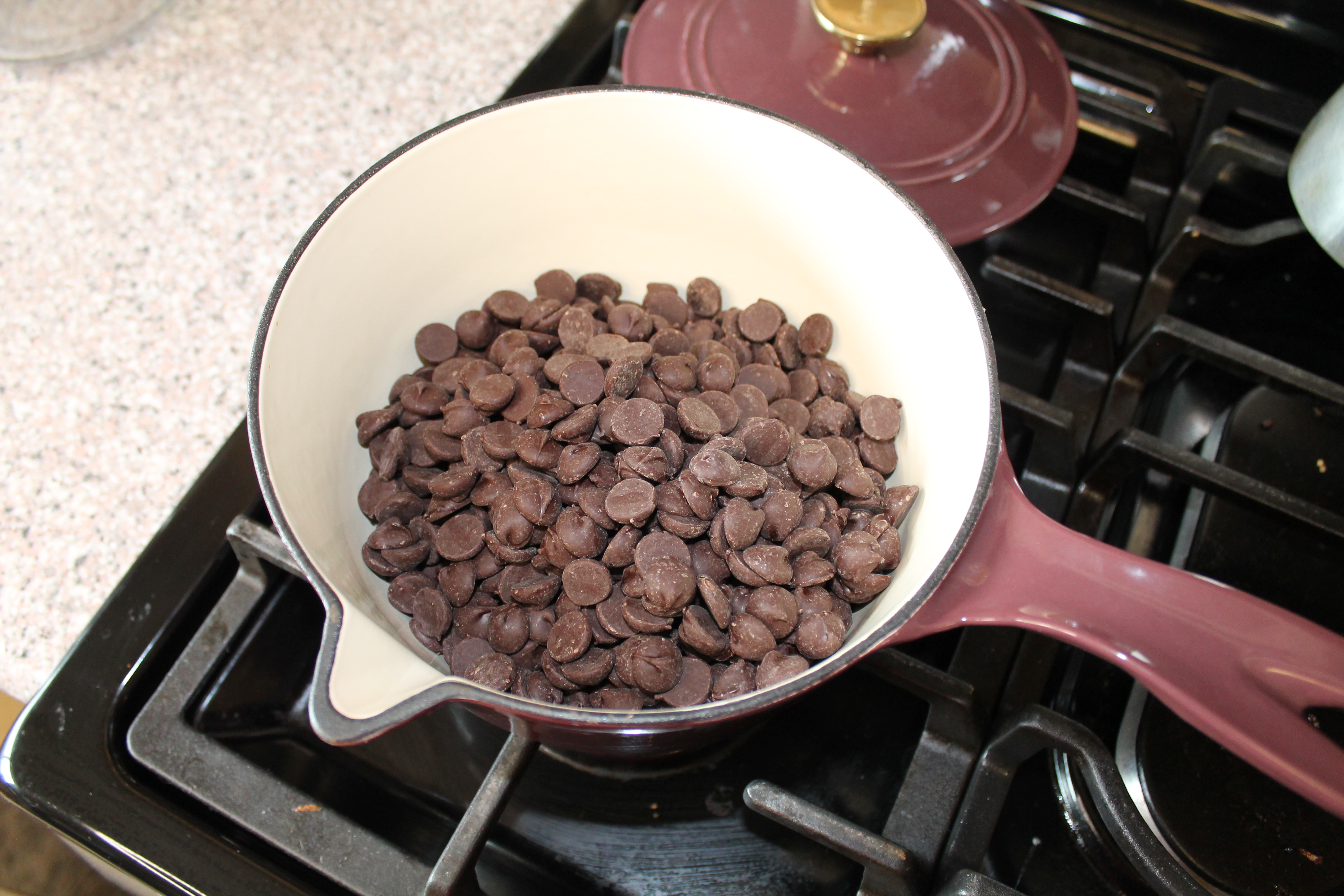 2. In a small pot place the dark chocolate (you can use chips or large pieces of chocolate but then cut that up in to small pieces). Turn the burner on low and stir constantly. Chocolate can burn so do keep a close eye on it.