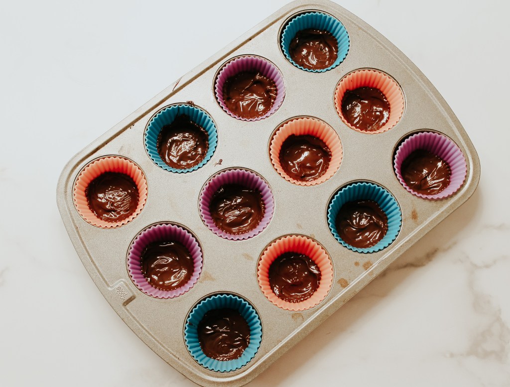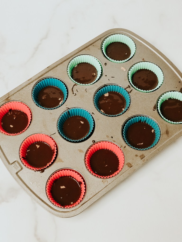 3. Then you will spoon in 1 1/2 Tsps. of the chocolate into each cup cake liner, rotating the liner as you go so that it gets a nice layer of chocolate on the bottom. One that is not to thick or thin. This is the part that took me a couple of tries to get just right. It also can be very messy but that is ok. Who doesn’t like to lick chocolate off ones fingers its the best way to clean them up. (I fine using a pastry brush can make this easier to do).